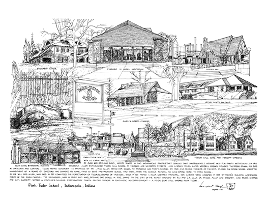 | Description: | Although the name Park Tudor was first used in 1970, this college preparatory school resulted from the merging of Tudor Hall and Park School, both long-time Indianapolis institutions. Prominent architectural landmarks on the Park Tudor campus are depicted in this pen and ink drawing by KP Singh. | |
